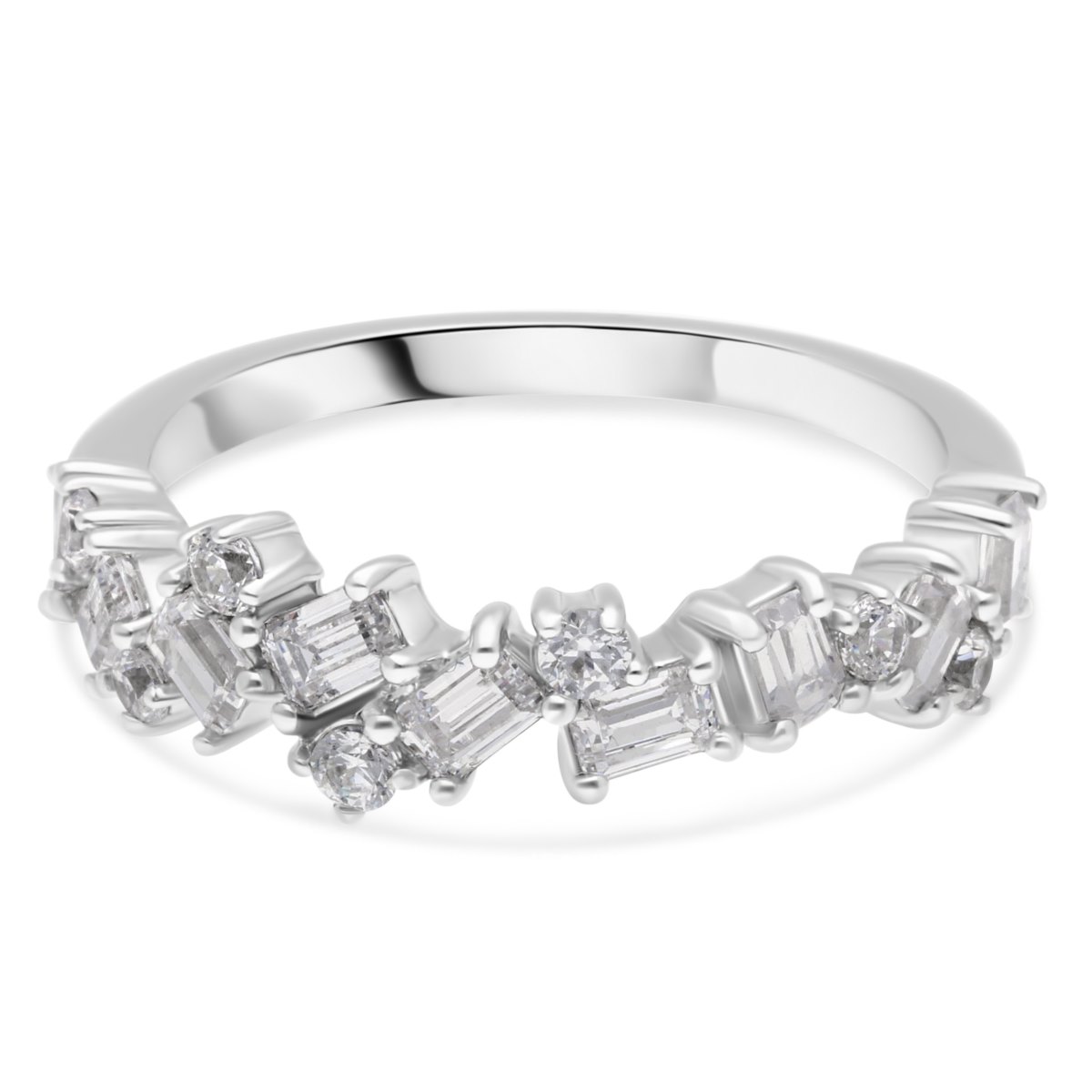 Une alliance demi-tour avec 10 diamants taille émeraude, alternés avec des diamants ronds et sertis de façon déstructurée, est un bijou à la fois audacieux et raffiné. Le design met en avant une disposition asymétrique où les pierres, de formes différentes, sont placées de manière irrégulière, créant un effet visuel captivant.