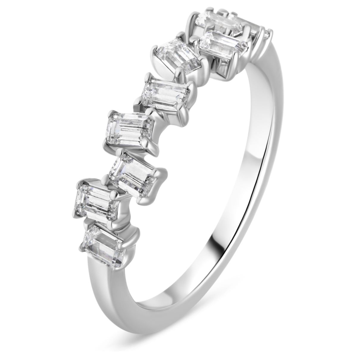 L'alliance demi-tour, Tamar, se distingue par un design moderne et unique. Contrairement à un sertissage traditionnel où les pierres sont alignées de manière symétrique, ici, les 9 diamants taille émeraude sont disposés asymmétriquement, créant une impression de spontanéité et de mouvement.