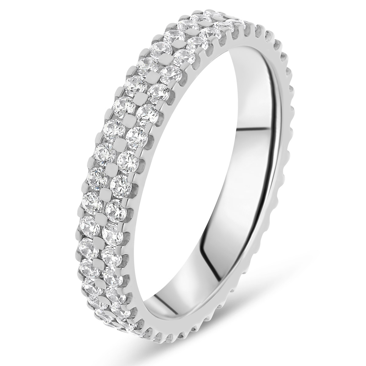 Une alliance de mariage à l'aspect contemporain en platine 950/1000 sertie en deux rangs de diamants de qualité HSI. Le modèle se décline en plusieurs versions de largeur / poids carat allant de 1,5 mm (ou 0,50 carats) à 4,5 mm (1,4 carats). Existe aussi en trois ou quatre rangs.