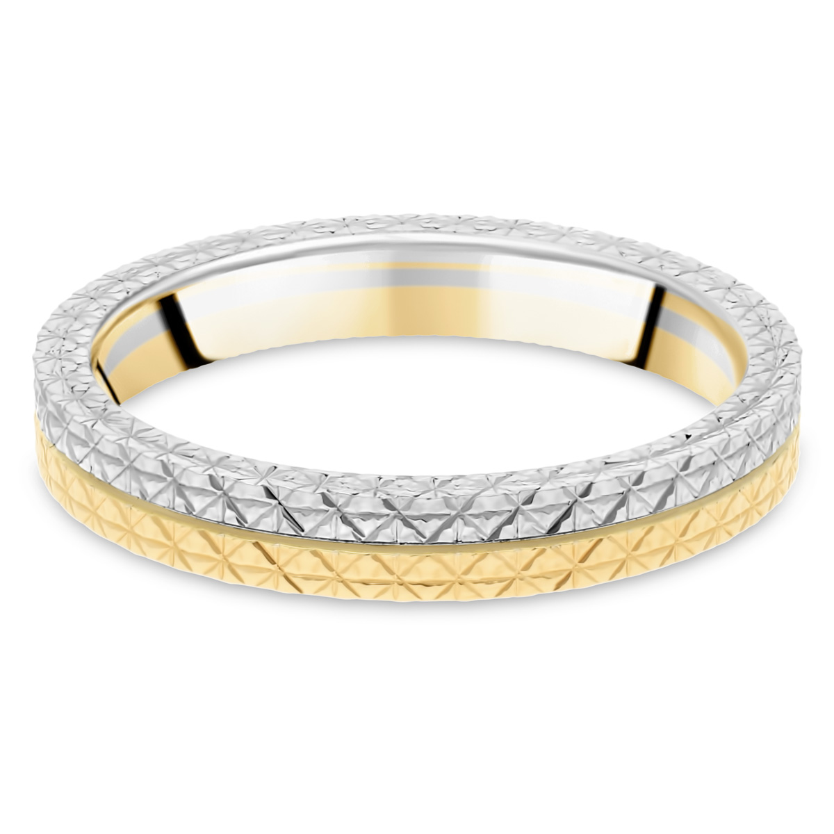 Une alliance de mariage contemporain pour femme, composée de deux anneaux, en platine et en or 18 carats, soudés côte à côte. Les anneaux sont ornés d'un motif diamanté. Les dimensions de la bague: 3 mm la largeur et 1,3 mm l'épaisseur.