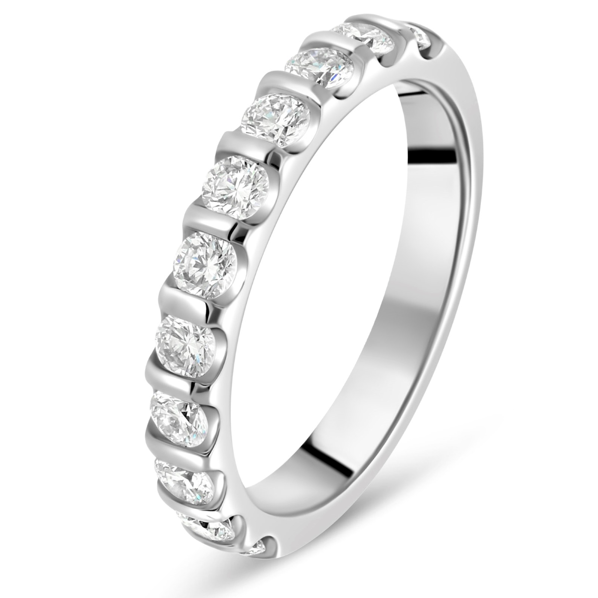 Élégante alliance de mariage pour femme en platine sertie en demi tour de diamants taille brillant de qualité HSI ou GVS. Les diamants sont enchâssés entre des barrettes de métal. Ce modèle est disponible en plusieurs versions allant de 0,25 à 1,5 carats. Son intérieur est massif pour permettre la gravure et arrondi pour un meilleur confort au porté.