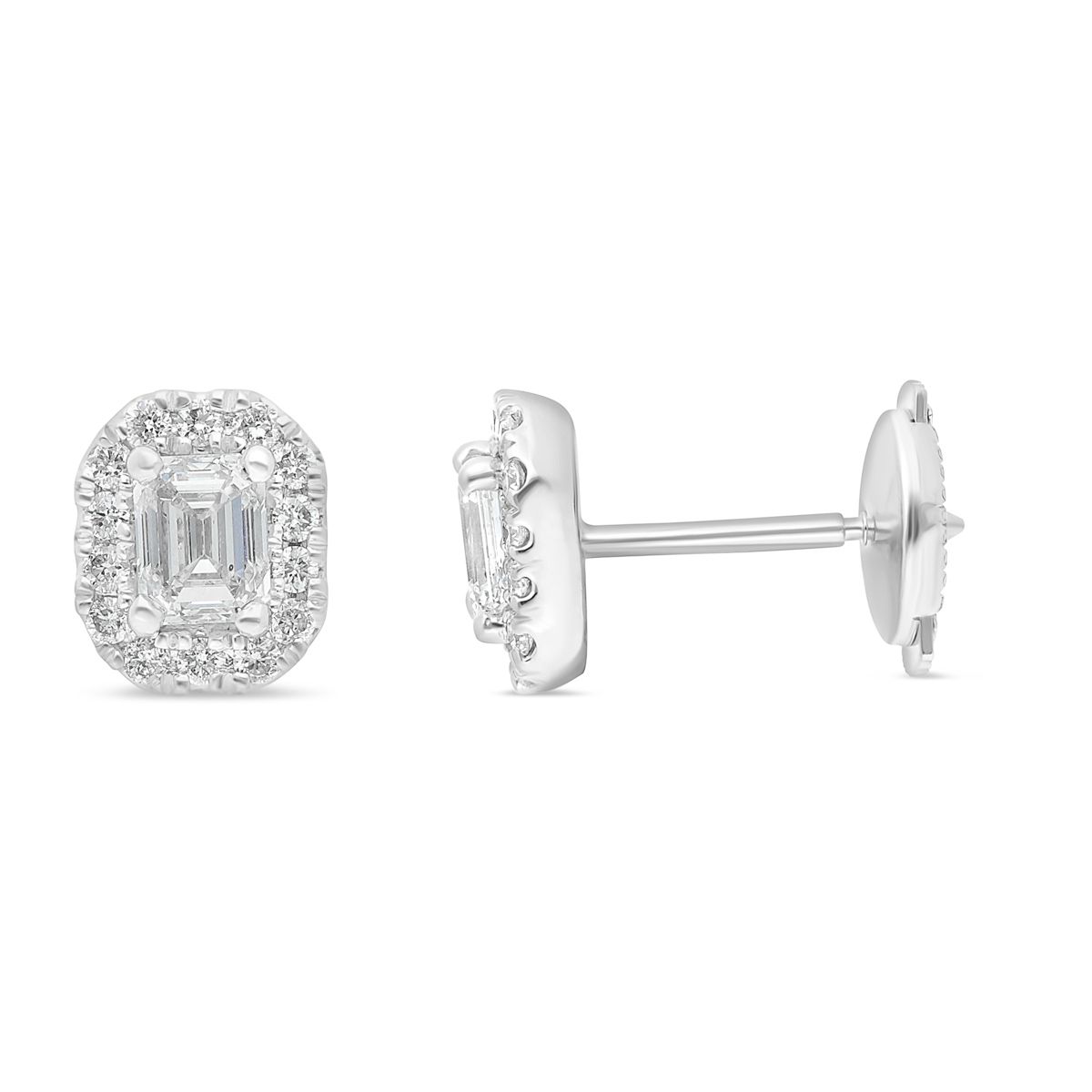 Les boucles d’oreilles Curieuse en or blanc 750 millièmes se distinguent par leur design structuré et leur éclat sophistiqué. En leur centre, un diamant taille émeraude attire le regard par ses lignes nettes. Il est sublimé par un halo de petits diamants qui épouse parfaitement sa forme.