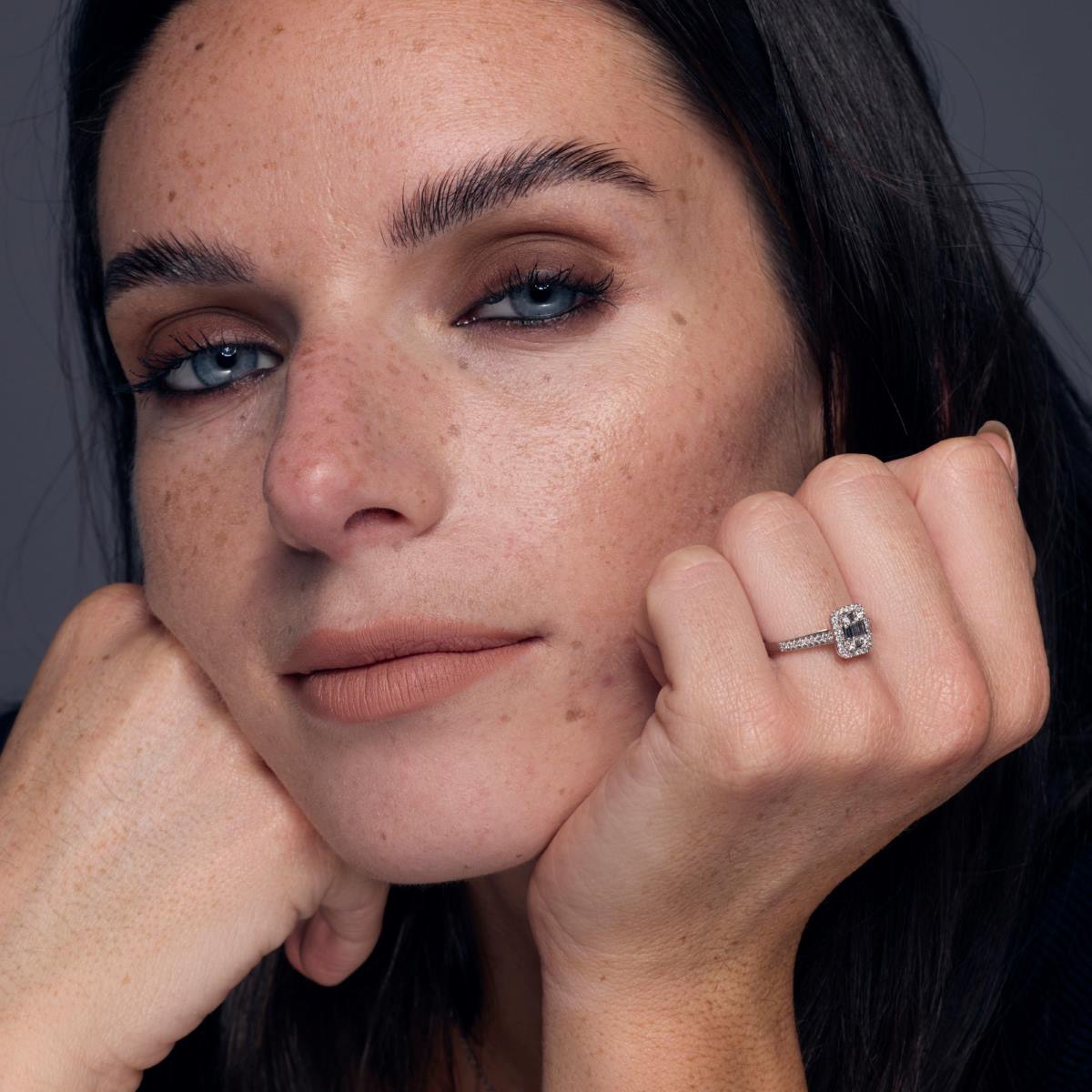 Une bague de fiançailles en diamants naturel HSI et en or 750 millièmes. Son centre de 8,8 mm sur 7,4 mm est composé de diamants taille baguette sertis de manière à créer l' illusion d'une taille émeraude, et entouré de diamants sertis en grains. Le corps de 2,4 mm de largeur est pavé sur sa partie supérieure de diamants sertis en grains.