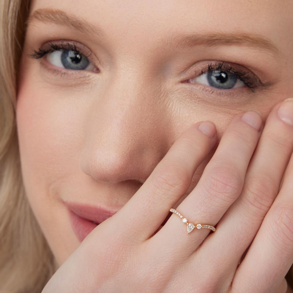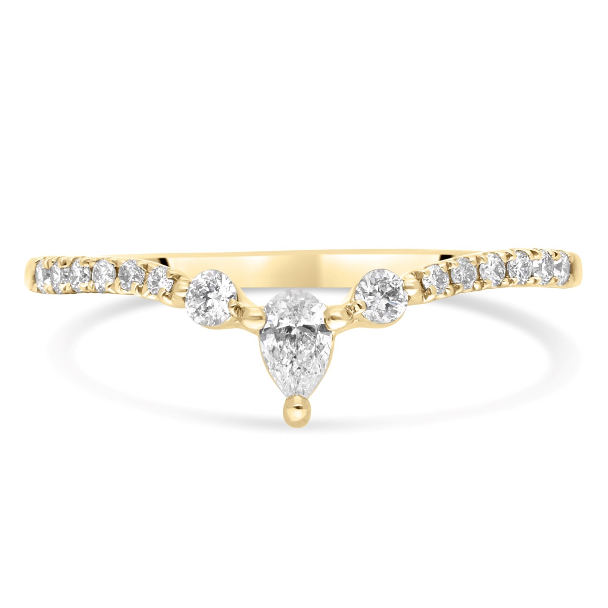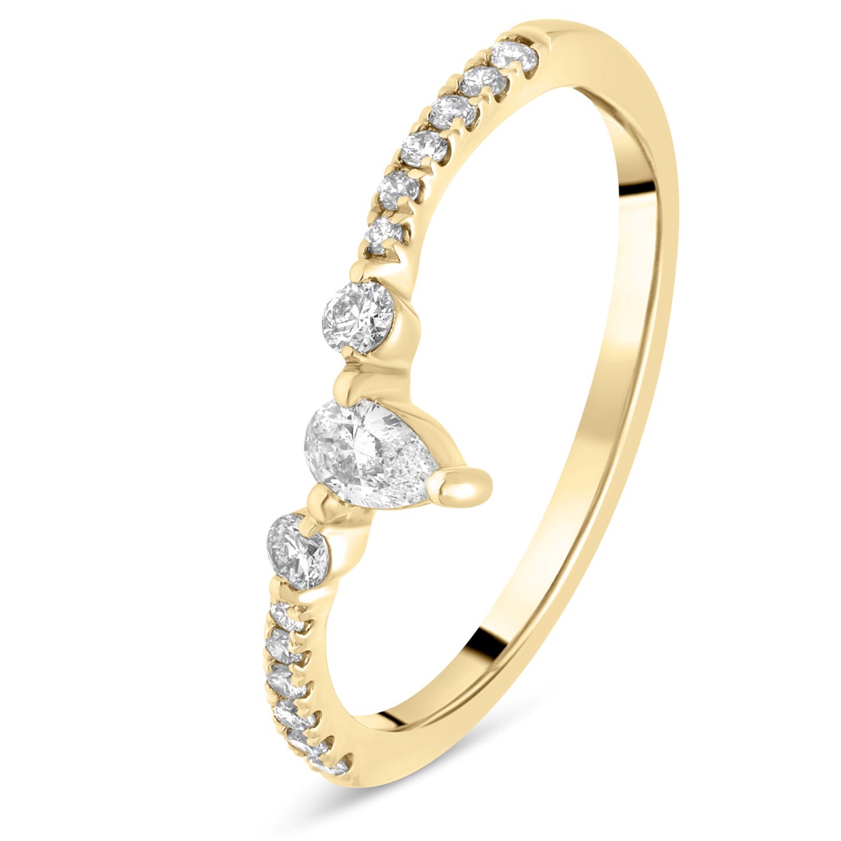 Au centre, un diamant en forme de poire est magnifié par un entourage de diamants ronds sertis en demi-tour qui prolongent l’éclat du bijou avec subtilité.