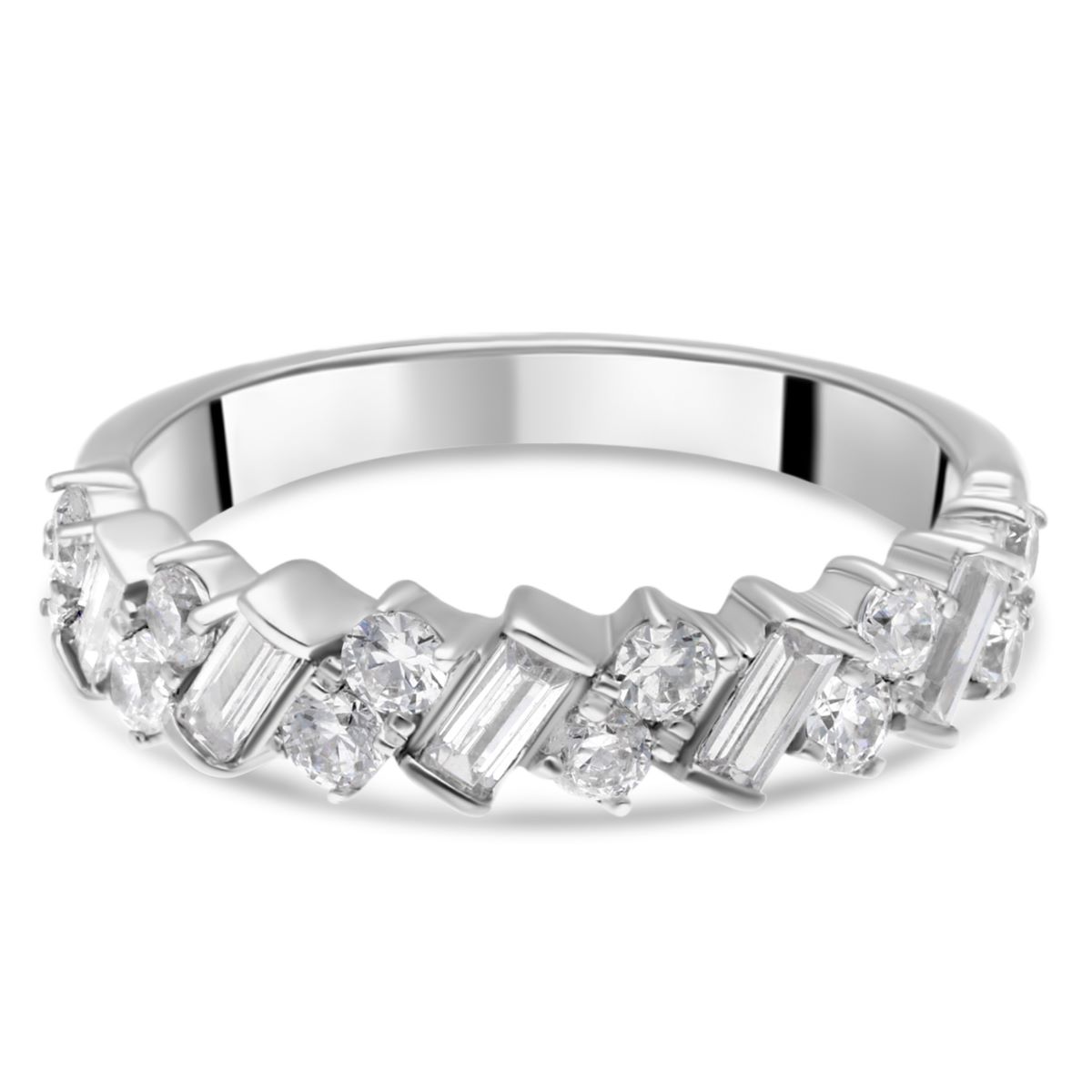 Notre alliance « Sybille » allie modernité et élégance avec un design unique qui alterne des diamants baguettes et ronds. Les diamants baguettes, inclinés avec précision, créent des lignes épurées et angulaires, offrant une brillance discrète et raffinée. Entre chaque baguette, deux petits diamants ronds, sertis verticalement, apportent un éclat plus classique et scintillant, accentuant la délicatesse du design.