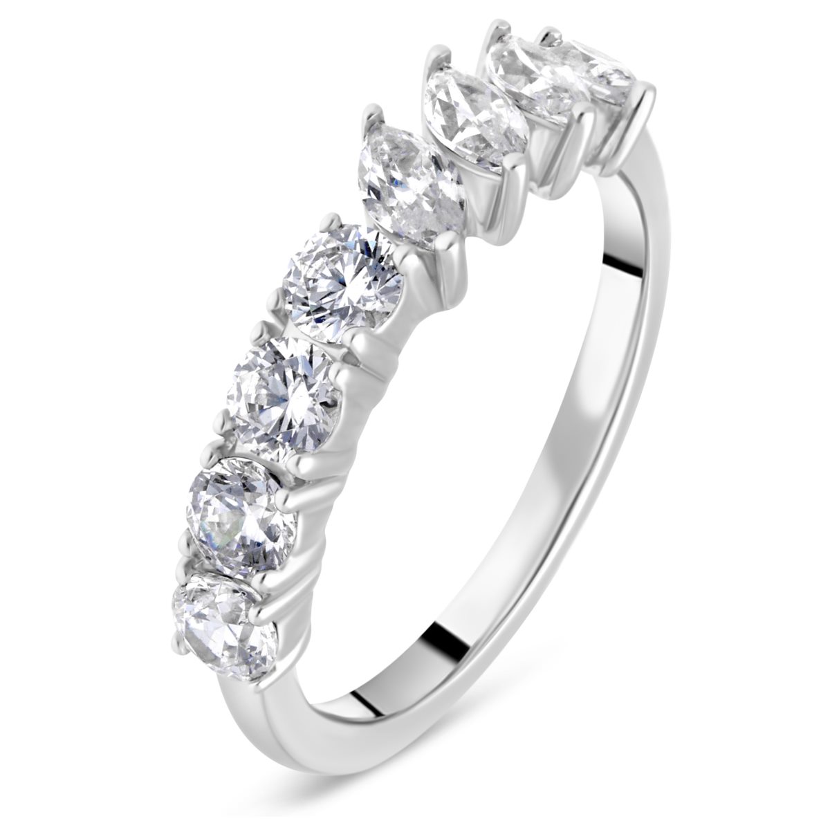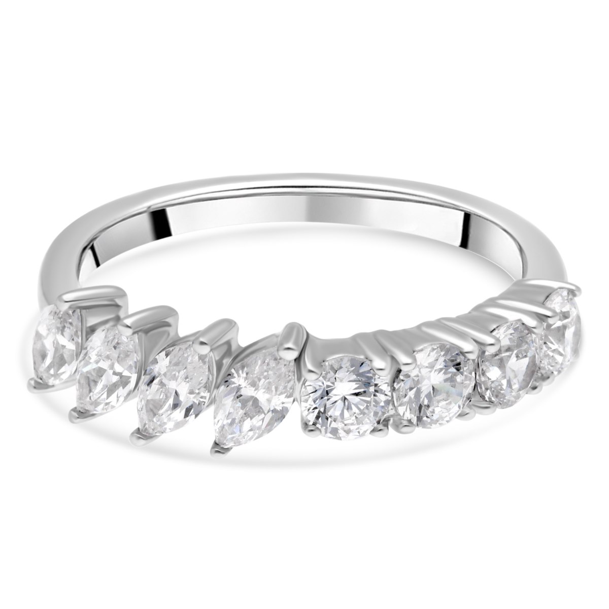 Cette alliance en platine se distingue par son design unique, mêlant élégance classique et originalité. Sertie en demi-tour, elle présente une alternance harmonieuse de quatre diamants marquises et de quatre diamants ronds. Les diamants marquises, avec leur forme allongée, apportent une touche d’audace et de sophistication, tandis que les diamants ronds, réputés pour leur scintillement maximal, complètent le design avec un éclat classique.