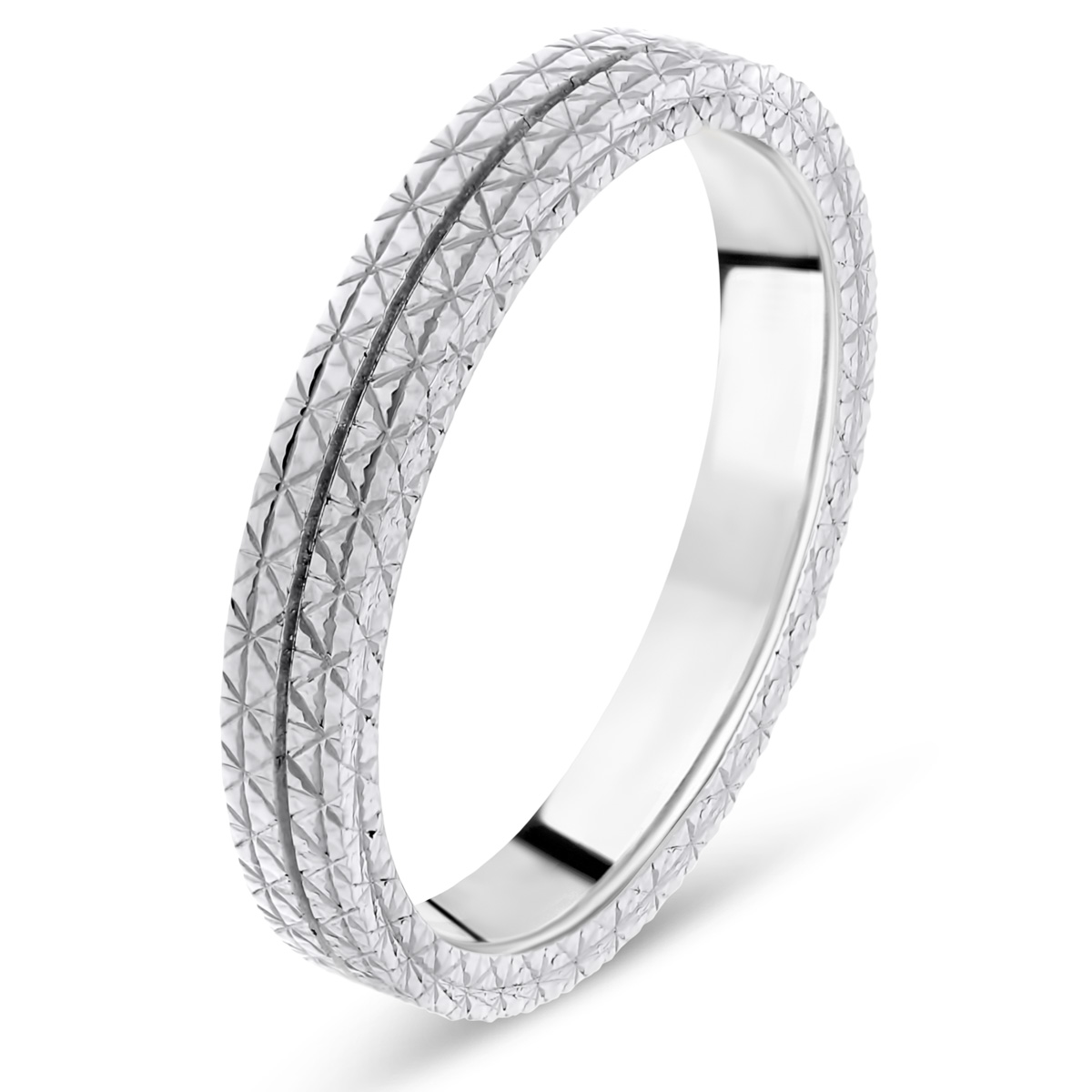 Une alliance de mariage contemporain pour femme, présentant deux rangées ornées d'un motif diamanté. La finition polie lui confère une allure brillante et très féminine. L'alliance peut être confectionnée en or blanc 18 carats ou 9 carats.