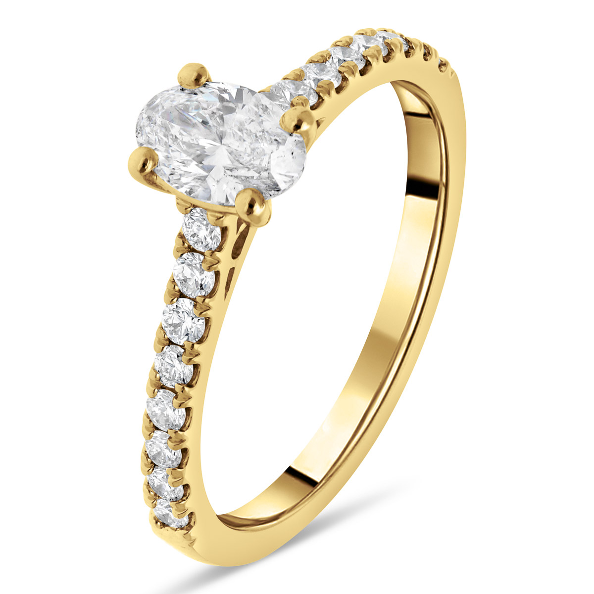 Cette bague de fiançailles somptueuse est ornée au centre d’un diamant ovale, accompagné par de petits diamants sertis sur la moitié de son tour. L’ensemble équilibre la simplicité et l'opulence, en offrant un scintillement subtil lorsque la bague bouge.
