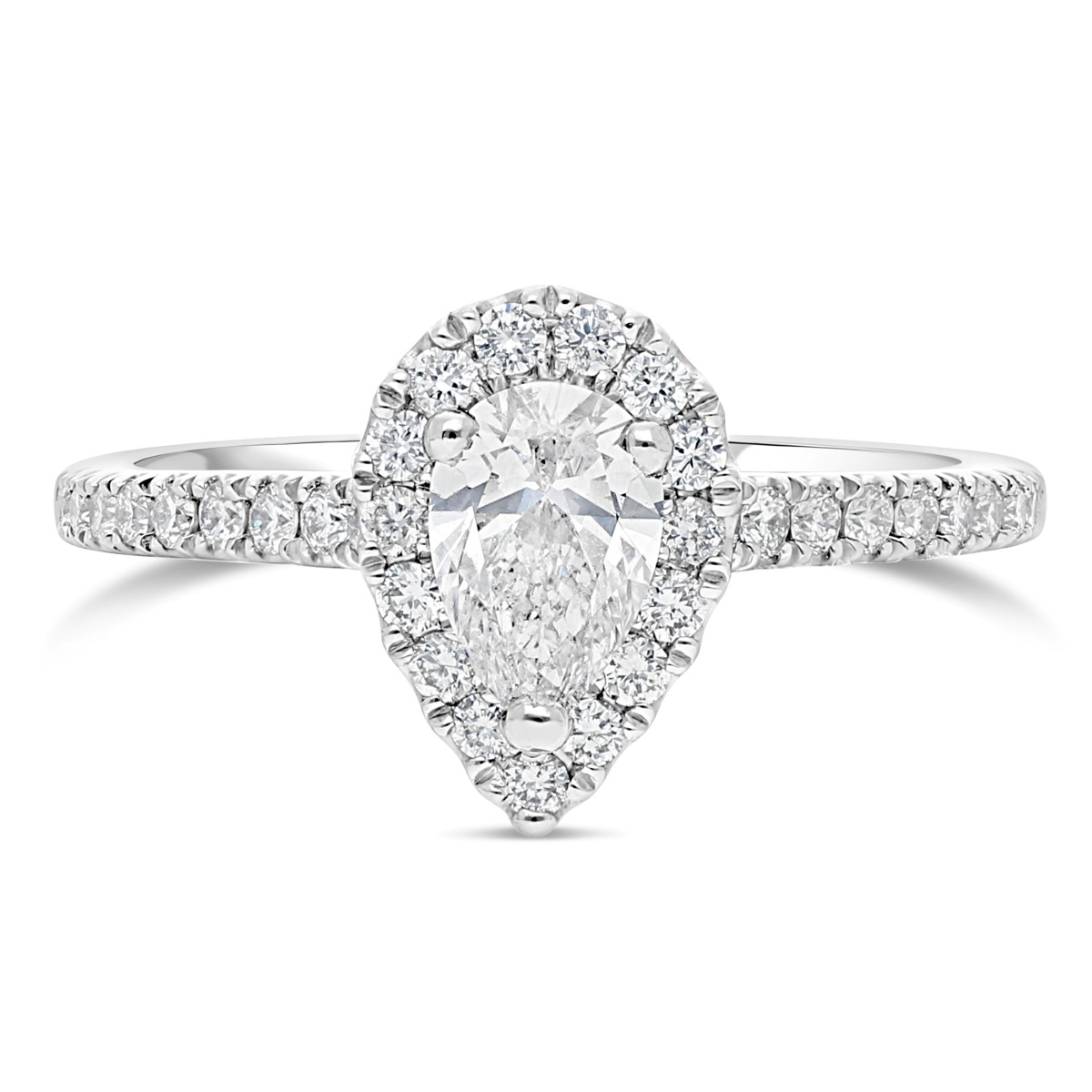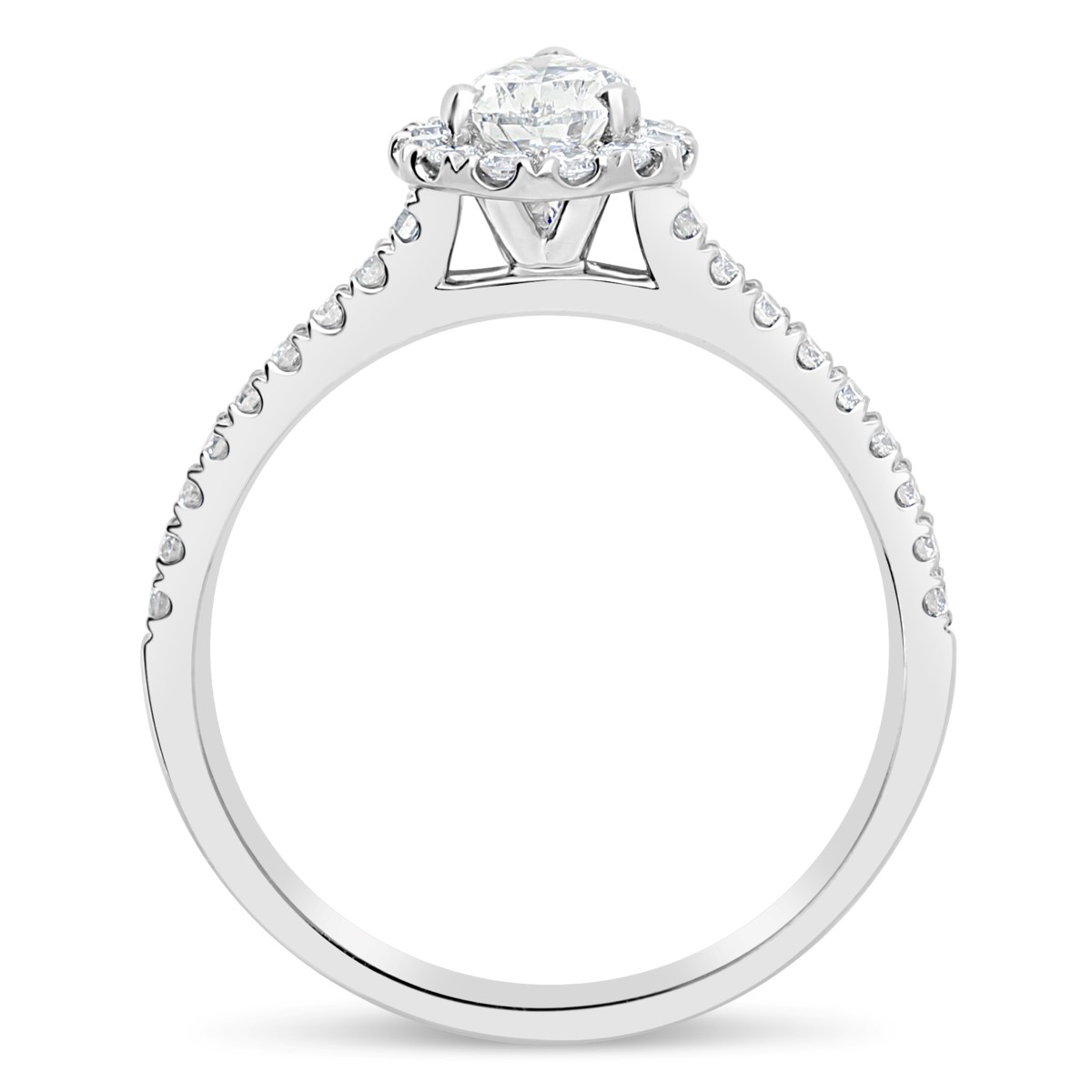 Cette bague en platine présente au centre, un diamant poire, le point focal de ce design élégant. Ce diamant poire est entouré d'un halo de petits diamants ronds, formant un cercle scintillant qui accentue la forme unique de la pierre centrale et amplifie sa luminosité.