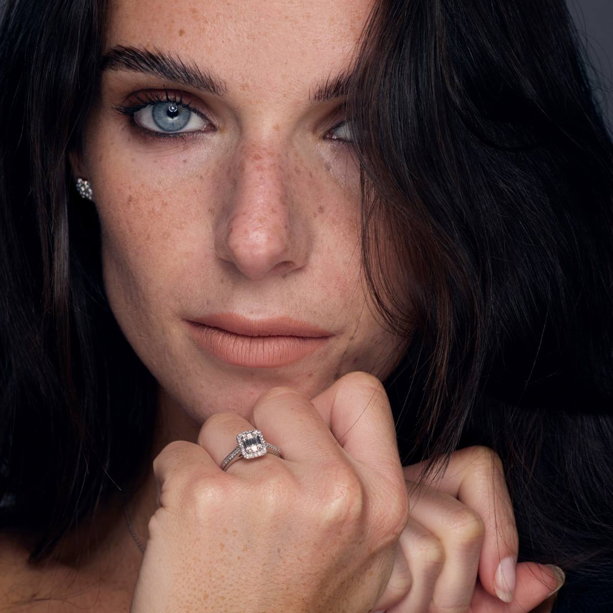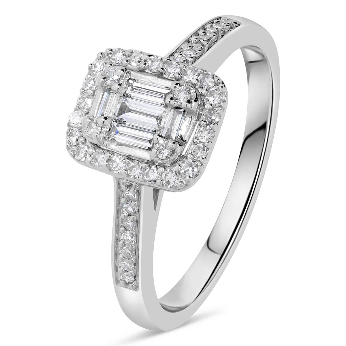 Une bague de fiançailles en diamants naturel HSI et en or 750 millièmes. Son centre de 9,3 mm sur 7,9 mm est composé de diamants taille baguette sertis de manière à créer l' illusion d'une taille émeraude, et entouré de diamants sertis en grains. Le corps de 2,4 mm de largeur est pavé sur sa partie supérieure de diamants sertis en grains. La bague s’emboîte parfaitement avec l'alliance ALD3010W.