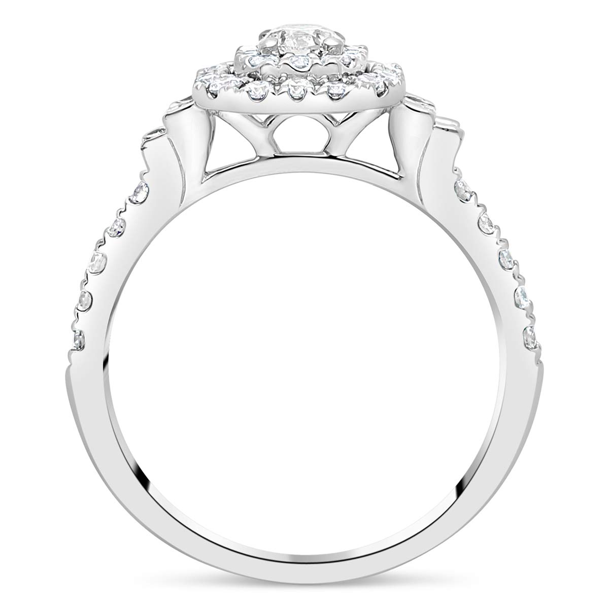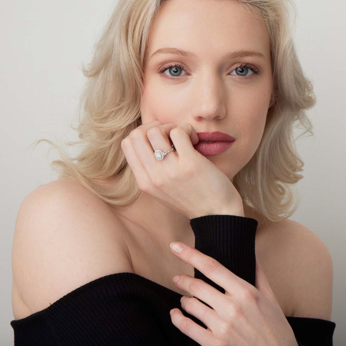 Une bague de fiançailles en or 750 millièmes (18 cts) composée d'un solitaire accompagné d'un pavage de diamants en forme émeraude (la longueur de 10,1 mm et la largeur est de 9 mm) et d'un anneau avec diamants. La largeur de l'anneau est de 1,7 mm. La pierre de centre en diamant est de 0,18ct, les diamants qui subliment le diamant central sont d'un poids total de 0.57 ct et de qualité H (couleur) et SI (pureté).