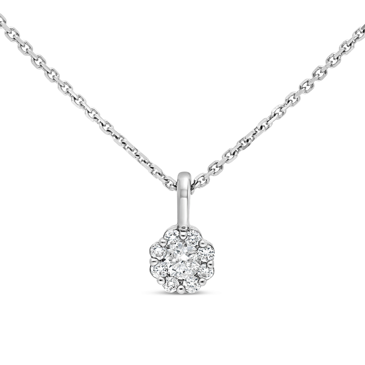 Collier serti de diamant pavés en fleur. Le pendentif est vendu avec sa chaîne en maille forçat de 42 cm (réglable). Le diamètre du pendentif est de 4,5 mm (la longueur avec la bélière est de 7,8 mm).