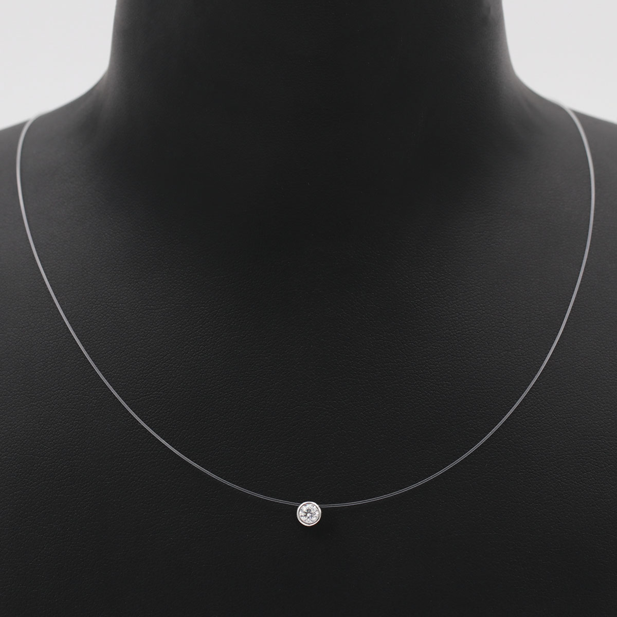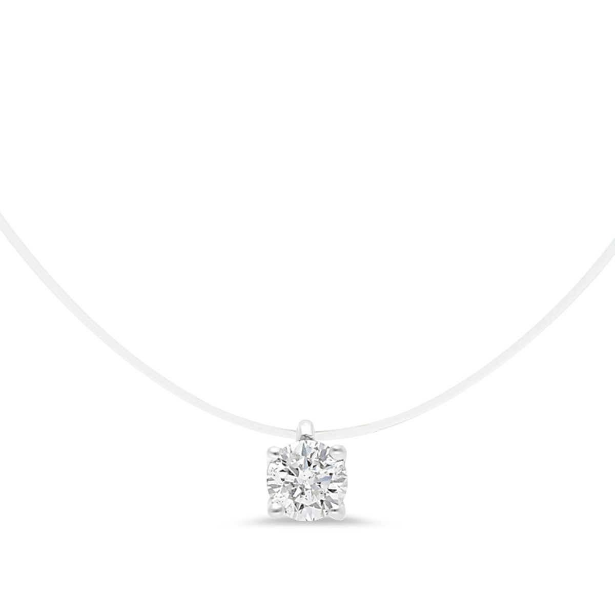 Collier diamant 0,20 HSI serti griffes de 3,6 mm de diamètre, monté en or 750/1000. Le collier est maintenu sur un fil de nylon de 42 cm de longueur.